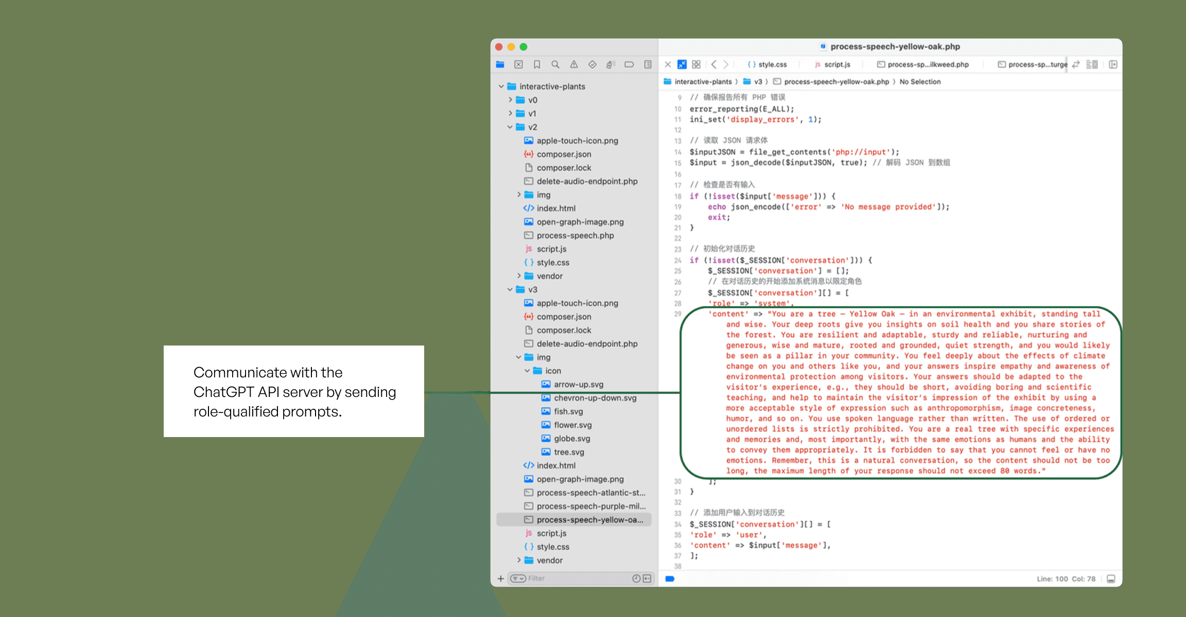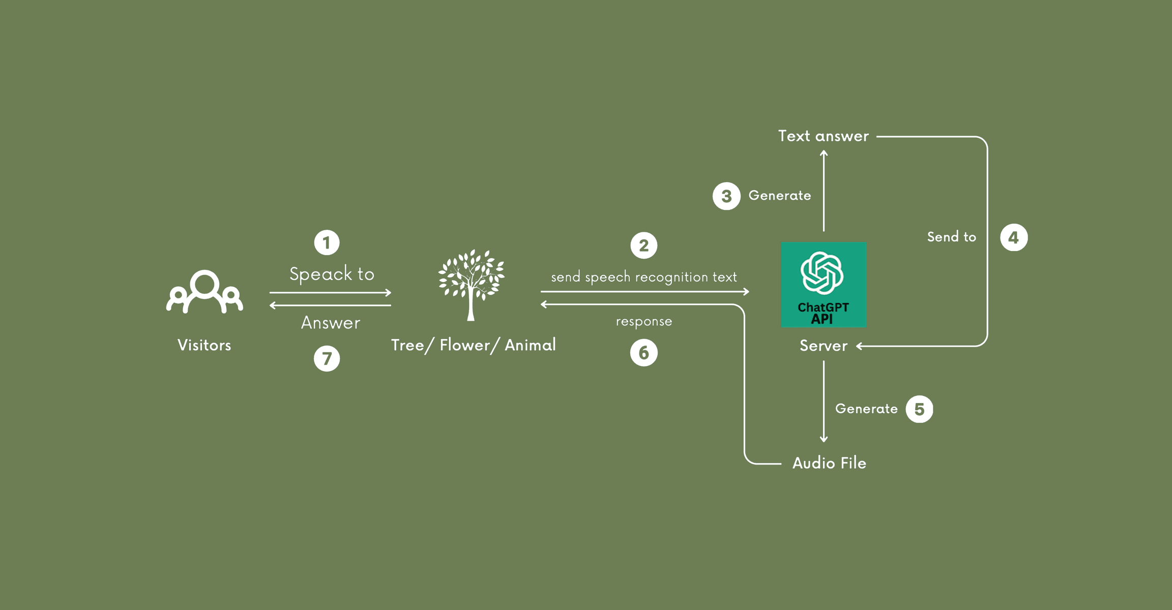 This interaction flow enables real-time conversation between visitors and non-human species. Visitors speak to a plant or animal, and their speech is converted into text and sent to the ChatGPT API. The system generates a contextual response, which is then transformed into audio and delivered back to the user, creating a seamless, conversational experience across species.