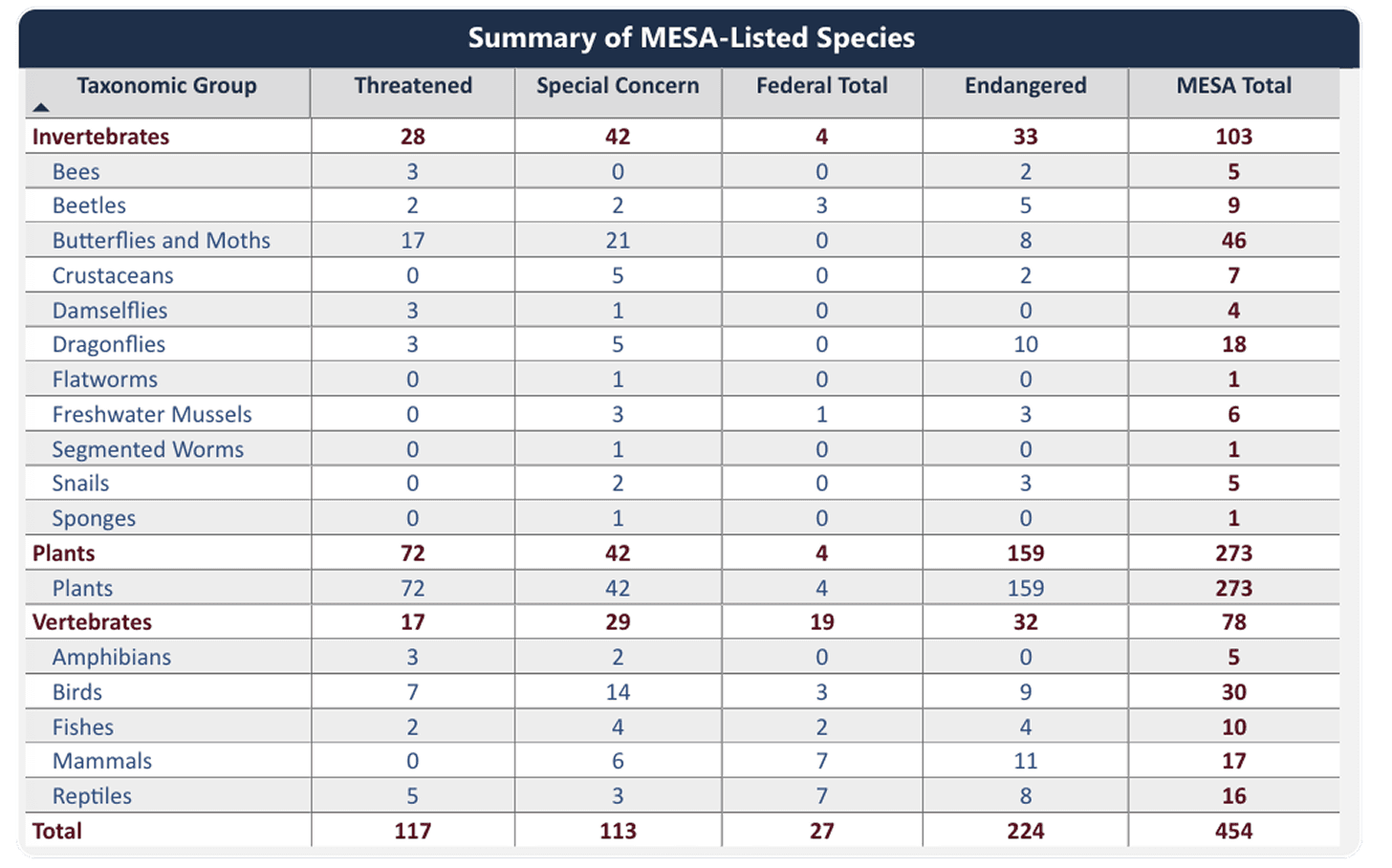 180 species of animals and 273 species of plants are protected under the Massachusetts Endangered Species Act. These 453 native species are listed as Endangered (E), Threatened (T), or of Special Concern (SC) and are tracked in our database. These species are either at risk or may become at risk of extinction. Rarity in the state, population trend, and overall threat are the main criteria used to determine extinction risk.