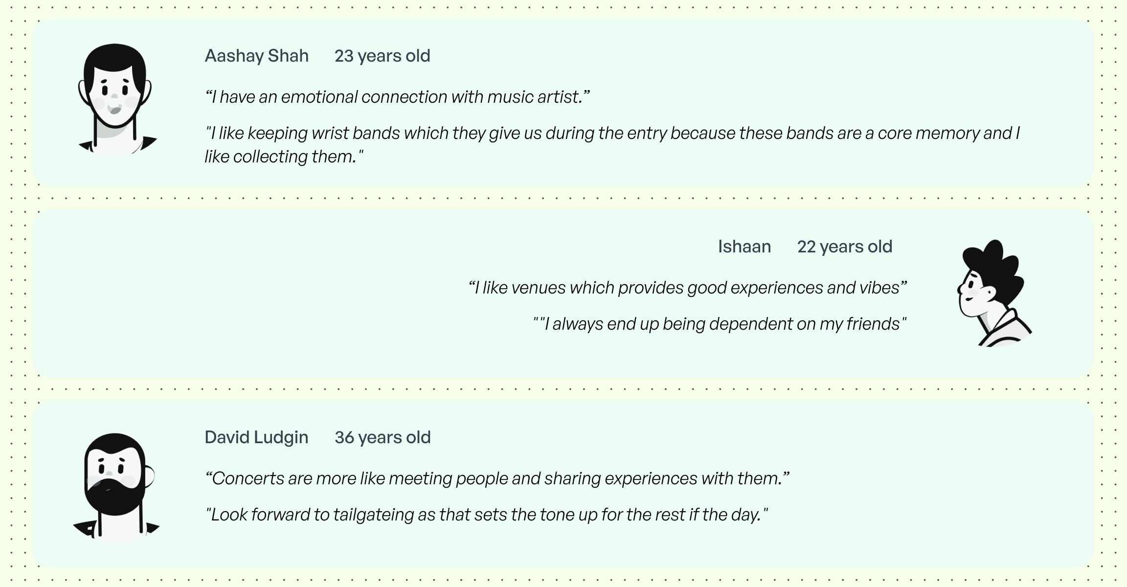 We interviewed general attendees to understand their past concert experiences. Participants were asked to reflect on both their best and worst concert experiences, helping us identify key moments that shape overall satisfaction.